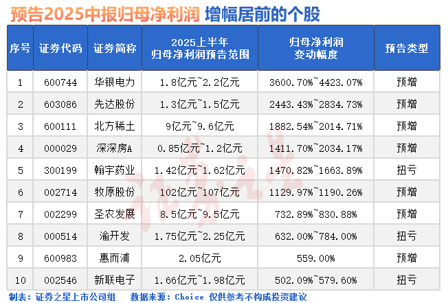 此外,深深房A、翰宇药业、牧原股份、圣农发展、渝开发、惠而浦、新联电子、翔港科技、英联股份、兄弟科技、广大特材、沃华医药、圣诺生物、泰凌微、豪鹏科技等多只个股同样预计上半年净利润有望大增。
